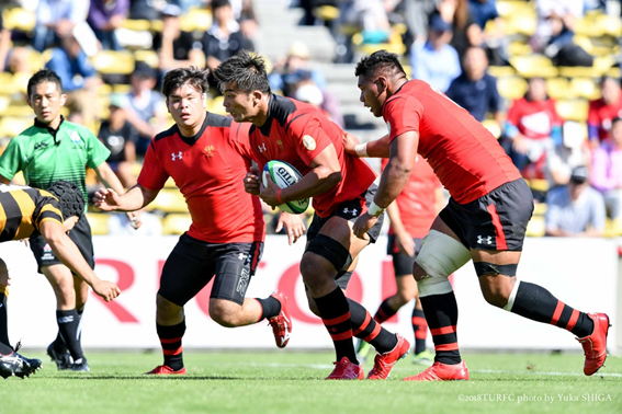 スクラムから連続攻撃。ラックから、SH小畑-FB竹山と渡り、竹山が前方へキック。自ら追いかけ、セービングしながらうまく確保し、走り込んできたSO北村にパス。そのまま北村がトライ。ゴール成功。