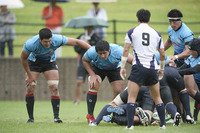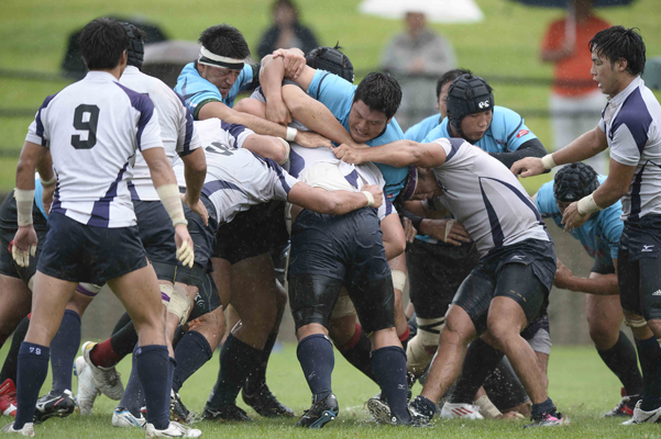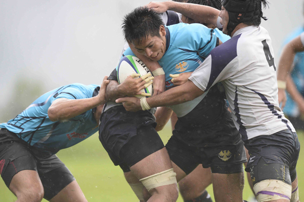 亀井、FL服部らが水の浮くグラウンドでも懸命のタックル。BK陣も奮闘。終了間