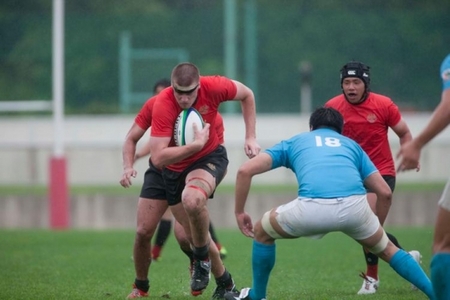 季節外れの台風の接近で、2週連続、雨の中での試合となった。強く降ったかと思ったら小やみになり、すぐにまた強く降るという、集中力の持続も難しい悪天 候の中、我慢の戦いが想定されたが、今年の目指すラグビーをどこまで徹底できるかにも注目が集まった。 序盤戦。試合は予想通り天候同様、試合開始直後か ら波乱の展開に。ミスを恐れず積極的なパス回しを試みる帝京だが、ボールが滑ってパスが乱れる。転がるボールをWTB菅谷がうまく足で処理したかに見えた が、判定はノックオン。続くセットプレー等では社会人のしたたかなプレーに自陣ゴール前まで攻め込まれる。開始2分、悪天候の不運さも手伝って7点のビハ インドを背負ってしまう。 その後も攻め込まれる苦しい展開が続く。キックで攻め込まれ、タッチに逃れても、相手ボールラインアウトでモールを組まれて攻 められる。だが、ディフェンスではしっかりと体を当て、帝京は踏ん張りを見せる。次第に、ラインアウトでの修正を試みる帝京。要所でしっかり競り合う意思 を見せると、相手のボールが乱れ始める。相手ボールのラインアウトが取れるようになると、攻撃機会も増加。BK、FW一体の帝京ラグビーでゴール前まで迫る。