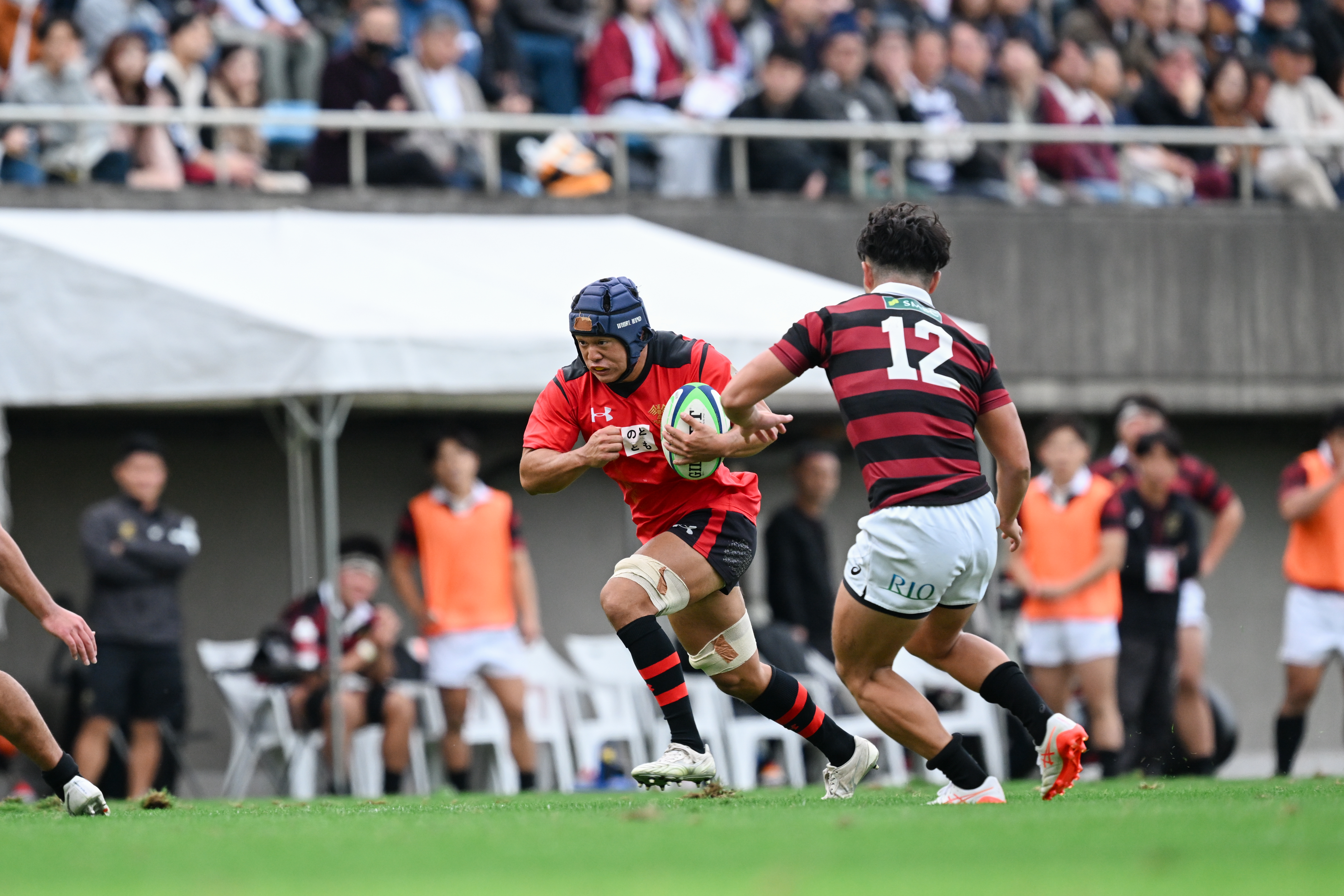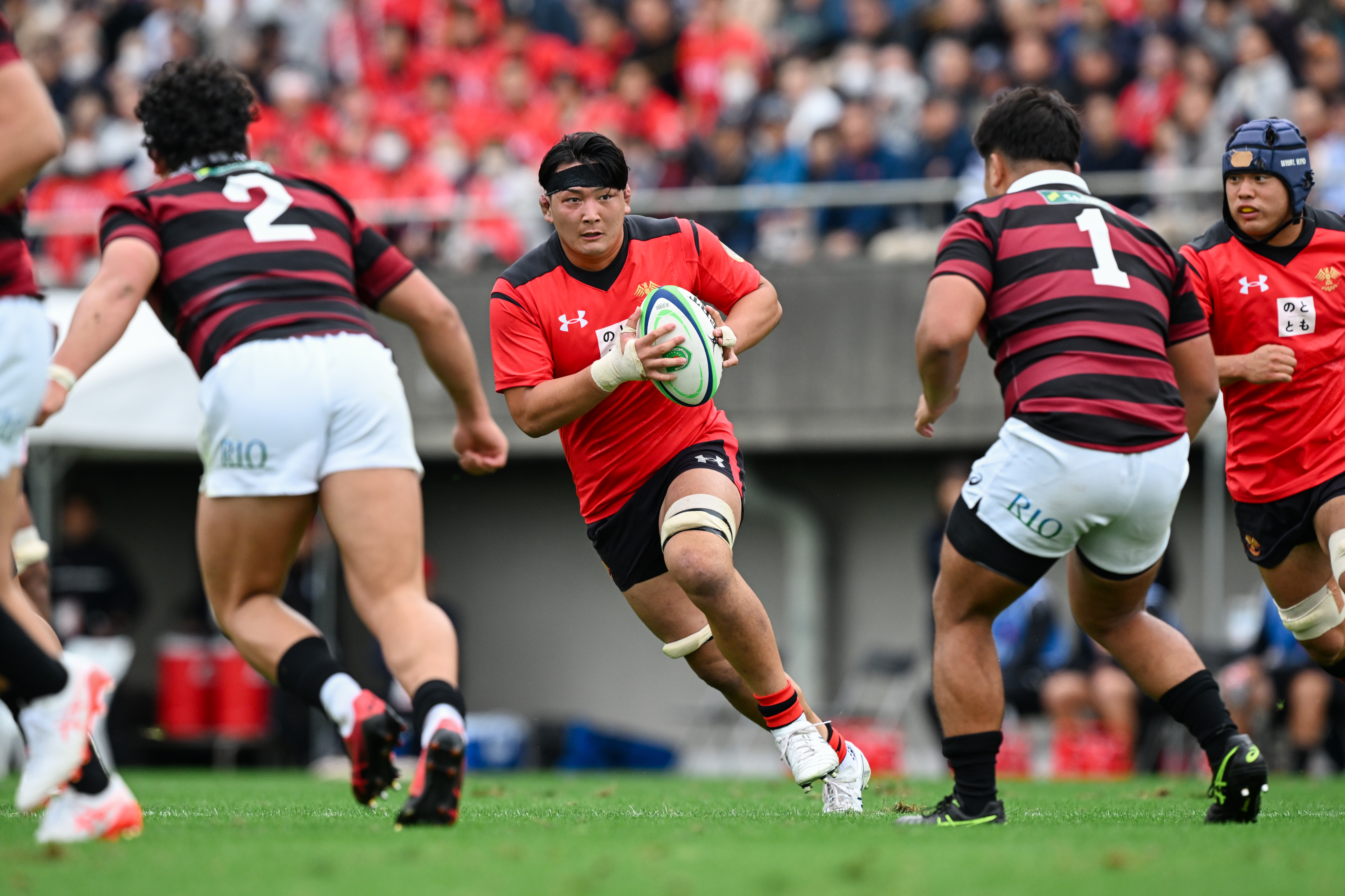 その後、スクラムでのペナルティでゴール前まで攻め込まれるが、モールでPR森山がボールを奪って防ぐ。ただ、帝京もなかなかチャンスを活かし切れず、エリアを戻される。膠着しているわけではなく、ボールがよく動きつつもお互いの激しさがぶつかり合う、非常に見応えのあるゲーム展開が続く。