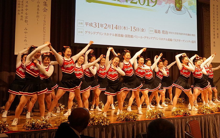 当日は、バッファローズは懇親会のメインアトラクションとして登場し、大きな歓声で迎えられ、ダンスや4人1組で行うパートナースタンツなどを流行の音楽に合わせてパフォーマンスを行いました。また、終盤には学会名である「JSPEN」をポンポンで披露すると参加者からはひときわ大きな拍手がありました。