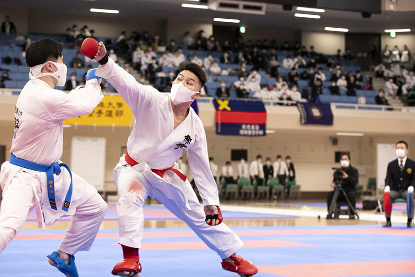 久々の有観客開催により、学生の保護者や空手道部関係者が見守る中、女子団体組手は12年連続通算12回目の優勝を果たしました。新チームとして初めての試合とは思えないほど、序盤から冷静で落ち着いた試合姿は出場大学の中でも圧巻でした。男子団体組手は準決勝で惜しくも敗れ、男女ともに優勝とはなりませんでしたが、本学空手道部監督・師範の香川政夫は、「女子は上級生が安定した試合運びを行うことができたので、初めて出場した下級生も伸び伸び試合に臨めたのが良かったです。男子は、昨年大学日本一になった中心メンバーが4年生になり、立場が変わったことでまだまだ成長すべき課題があるということがわかりました。伸びしろは十分なので、喜びは秋の全日本大学空手道選手権大会に取っておきます」と話しました。
