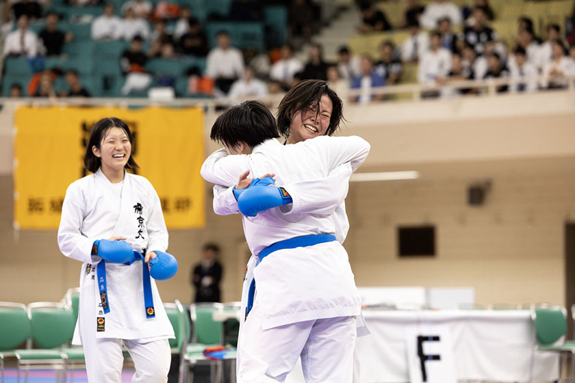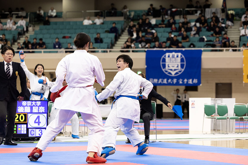 女子団体組手では、前期の個人戦で力を発揮できず悔しい思いを抱えていた女子主将の後藤星奈(医療技術学部4年)をはじめ各選手が気迫のこもった試合展開を見せ、大将戦までもつれ込む激闘を制し、勝利をつかみ取りました。