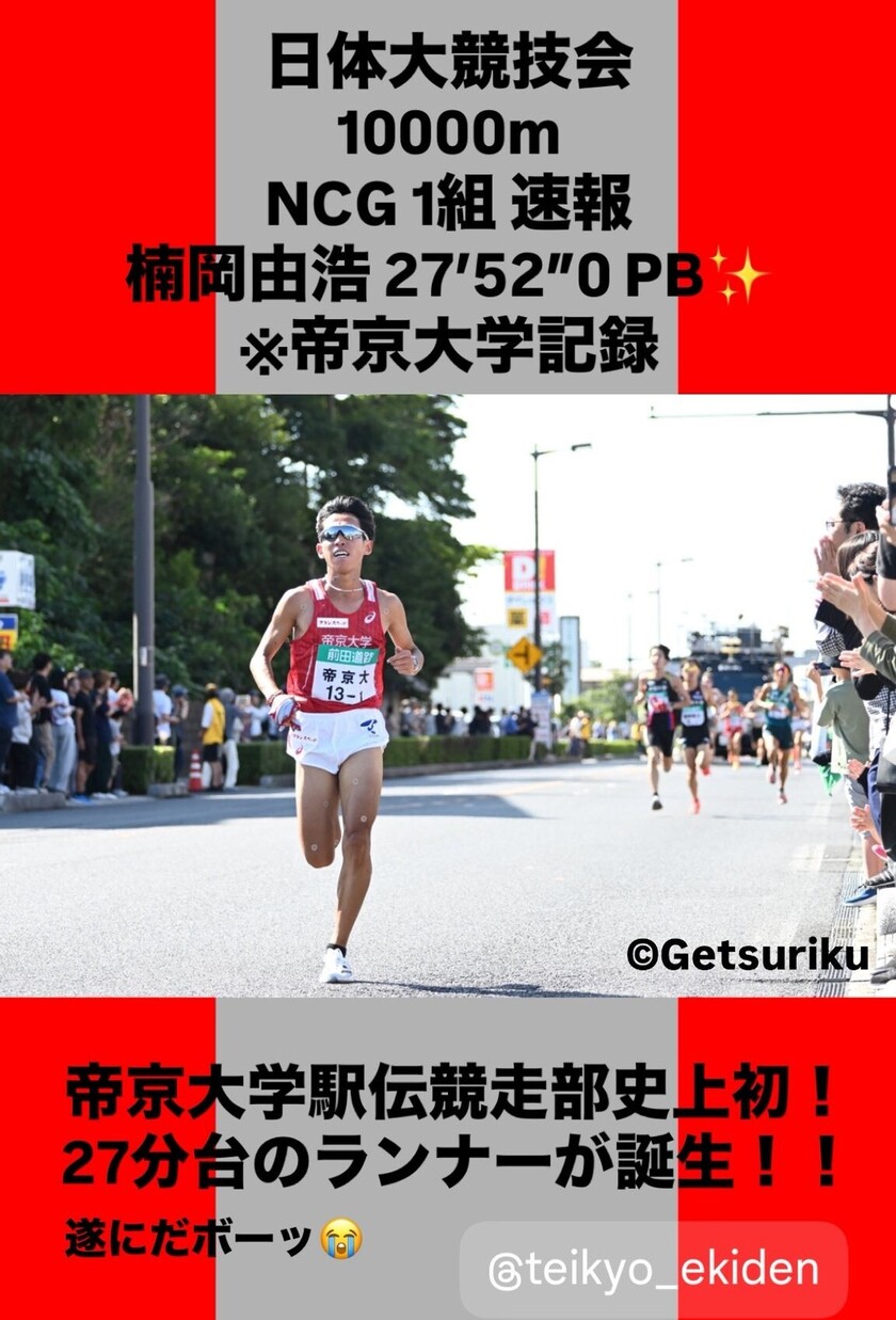 2025年11月15日(土)に行われた日体大記録会のNCG男子10000mにて、帝京大学駅伝競走部楠岡由浩選手が大学記録更新となる27分52秒(速報タイム)を記録!山中博生前主将(大阪ガス所属)が持つ帝京記録を約12秒上回り、帝京大学駅伝競走部史上初の27分台ランナー誕生となり、また2025年シーズンでも学生ランナーの最速で27分台の記録を出しました。